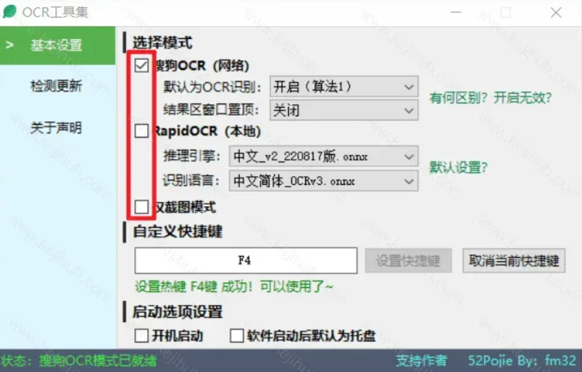 OCR工具集有三个模式:搜狗OCR、RapidOCR、仅截图模式,这三个模式中,搜狗的是网络截图识别,而RapidOCR是无须网络,本地识别即可。