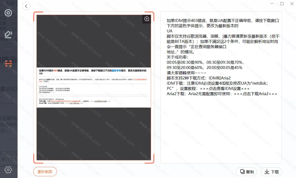 RapidOCR:作者集合了开源的RapidOCR本地引擎而完成的离线识别功能。选取了截图区域后,软件就会自动跳出识别出来的文字,而且在这里可以复制、朗读。默认情况下该窗口是置顶和自动复制结果的。