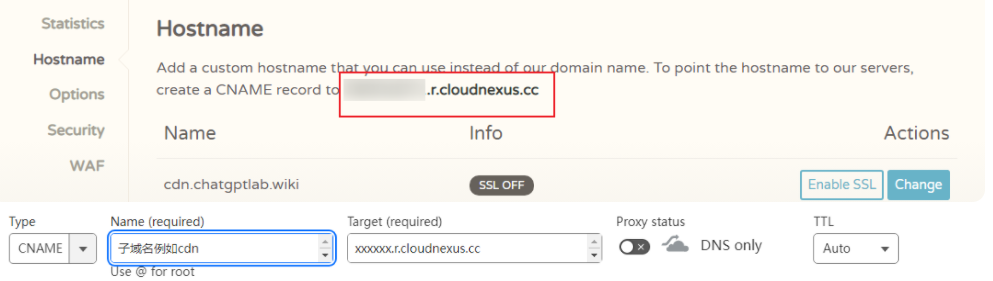 点击完成后,到你的cdn服务商添加一条CNAME记录到图中所示的地址,如果是使用cloudflare的话,不要打开小黄云,直接用cloudcone的CDN即可