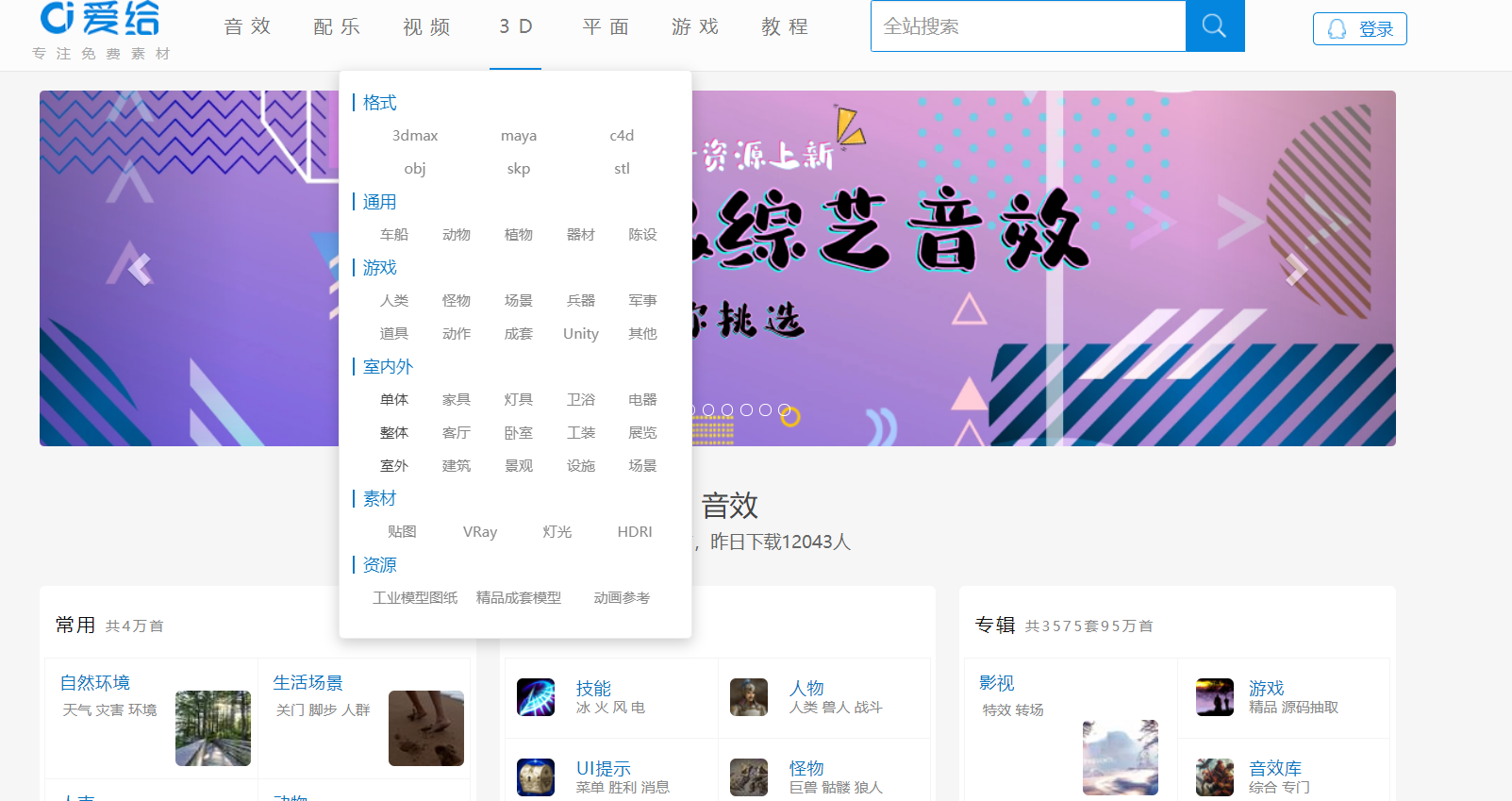 一个支持音效、配乐、视频、3D模型、游戏、平面等资源的下载,提供免费的在线教程