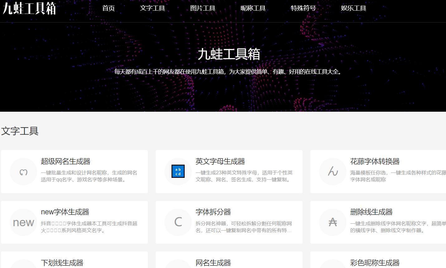 非常有意思的在线工具箱,里面提供着一堆五花八门的工具,比如各类各种各样的生成器,以及特殊符号大全、成语接龙查询器。